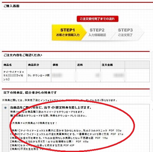 決済画面にて必ず「当商品をご購入の方に、当サイト限定特典を差し上げます。」の表示(赤丸部分)があることを確認してからお申し込みください。